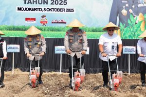 Kapolda Jawa Timur,Irjen Pol Drs.Nanang Avianto,M.Si memimpin langsung kegiatan penanaman Jagung serentak Kuartal IV tahun 2025 di Desa Pacing, Kecamatan Bangsal, Kabupaten Mojokerto, Rabu (09/10/2025).