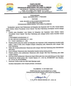 Beritarepublikviral.com, Palembang– Seleksi jabatan Direktur Utama (Dirut) Perusahaan Umum Daerah (Perumda) Tirta Musi Palembang mulai mengerucut. Panitia Seleksi (Pansel) resmi mengumumkan tiga nama yang dinyatakan lulus tahap Uji Kelayakan dan Kepatutan (UKK) dan akan melaju ke tahap akhir, yakni wawancara langsung dengan Wali Kota Palembang.