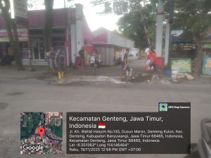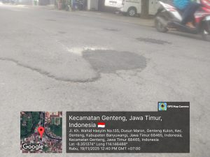 Lokasi jalan yang berada di Jl. KH. Wahid Hasyim, Dusun Maron, Genteng Kulon tersebut terlihat mengalami kerusakan yang cukup mengganggu aktivitas pengguna jalan.