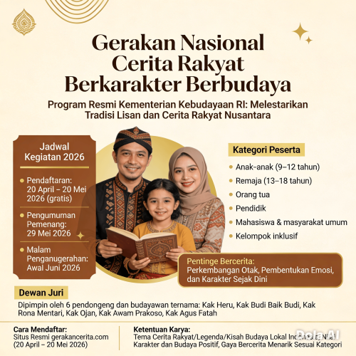Beritarepublikviral.com// Jakarta, β Sejak zaman dahulu kala, angin telah berhembus membawa bisikan-bisikan bijak dari satu generasi ke generasi berikutnya. Kisah-kisah itu tidak sekadar rangkaian kata; mereka adalah jiwa yang hidup, memeluk ingatan, dan menuntun langkah peradaban. Kini, saatnya kita memeluk kembali warisan tersebut melalui Gerakan Nasional Cerita Rakyat Berkarakter Berbudaya, sebuah panggilan hati dari Kementerian Kebudayaan Republik Indonesia, Dr. H. Fadli Zon, S.S., M.Sc.untuk menjaga agar tradisi lisan Nusantara tidak pernah padam ditelan zaman.